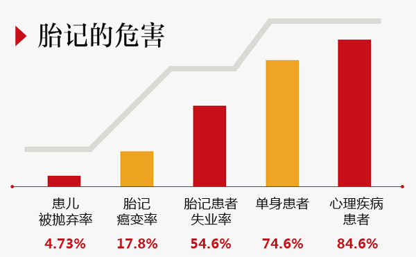 发现胎记后,应该尽早到医院鉴别是哪一种类型,除了少数胎记会自行消退不必处理外,80%的胎记都有一定的隐患,部分胎记会合并身体器官的异常,甚至有恶性变化的可能,必须积极治疗!例如有些海绵样的血管瘤增生过快,会造成肢体残缺,不只外观不好看,还造成功能障碍。甚至血管瘤扩张速度太快时,会形成组织坏死,过度消耗血小板而使凝血机能低下,出血不止。有些长了毛的兽皮样黑痣,可能日后发生恶性黑色素瘤的癌变,癌细胞转移后导致死亡。