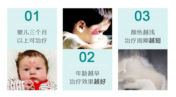 胎记一般出生时发生,很多人担心孩子太小,不能接受治疗,其实婴幼儿3个月之后是治疗的最佳时机。首先,婴幼儿的皮肤薄嫩,有利于激光的穿透,年龄越大,大部分胎记也会随之长大,激光治疗的次数可能就会比儿时多。其次,孩子新陈代谢快,治疗后恢复也很快。最后,婴幼儿时期早去除胎记,也免去了长大后可能承受的种种压力,有利于孩子身心的健康成长。